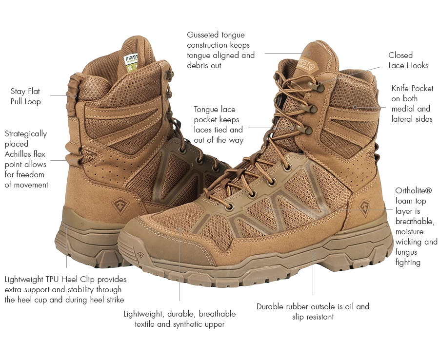 First Tactical’s Operator Boots are perfect for the mission at hand: lightweight and breathable while maintaining an unmatched level of durability needed for special operations. Boasting a Torsion Flex fiberglass reinforced composite shank that is 75% lighter than steel, the Operator takes inspiration from athletic shoes, providing the flexibility and comfort you expect from a running shoe but with the durability of your favourite tactical boot.