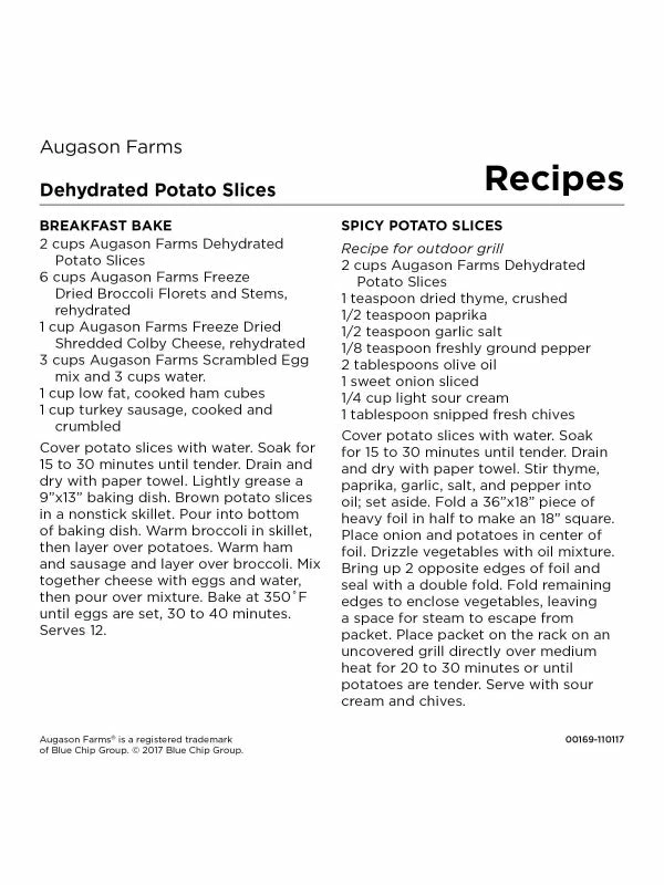 Dehydrating food is something Augason Farms knows a lot about. Our Dehydrated Potato Slices easily combine with other Augason Farms dehydrated vegetables to provide a nutritious, great tasting meal. Dehydrated Potato Slices are a great addition to any family’s survival food storage. And, they’re certified gluten free.