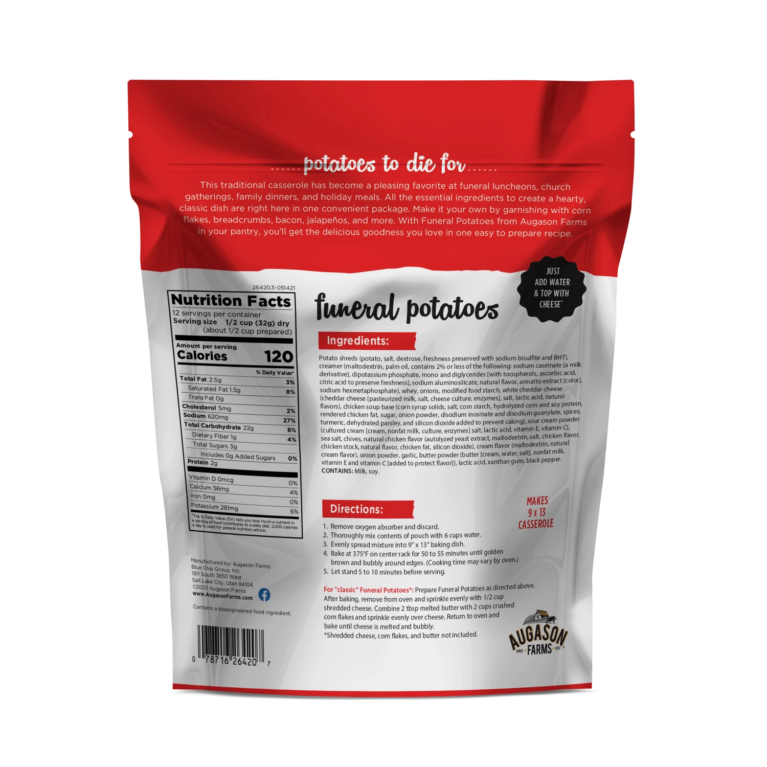 This traditional casserole has become a pleasing favourite at funeral luncheons, church gatherings, family dinners, and holiday meals. All the essential ingredients to create a hearty, classic dish are right here in one convenient package. Make it your own by garnishing with corn flakes, breadcrumbs, bacon, jalapenos, and more. With Funeral Potatoes from Augason Farms in your pantry, you’ll get the delicious goodness you love in one easy to prepare recipe.