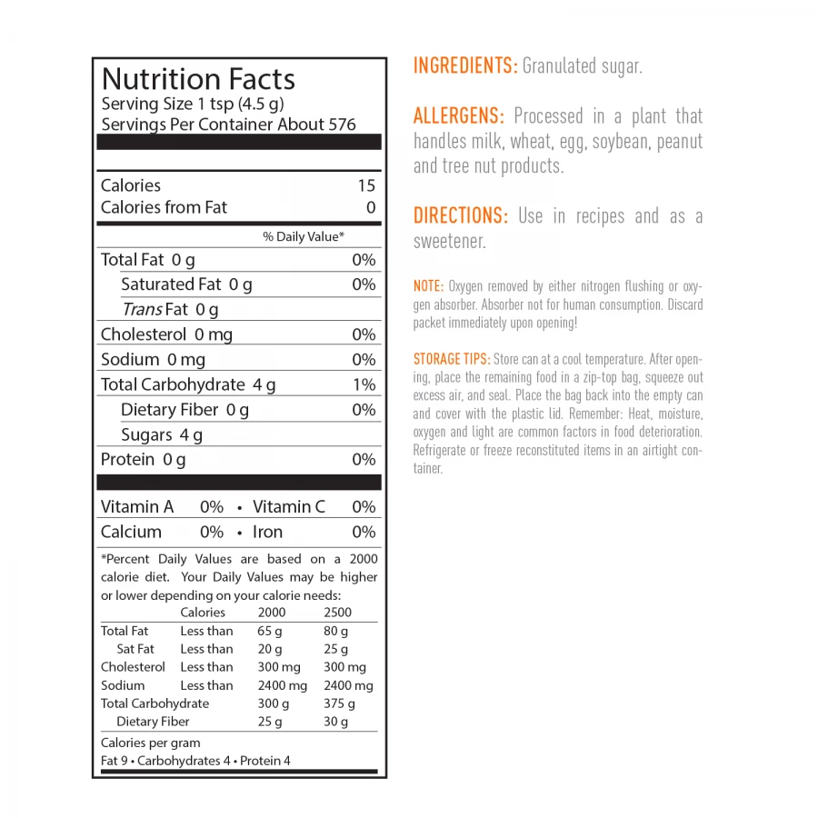 Emergency Essentials White Sugar is Packaged for long-term storage, so you can this important ingredient now or in the years to come. One of the basic components of an emergency food storage supply. Use in baking, cooking, or as a sweetener.