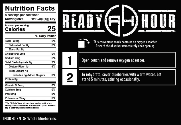 Ready Hour Has You Covered when it comes to helping you prepare for unforeseen events. All of our food Requires no refrigeration so you never have to worry about food spoiling in the fridge. Our Freeze Dried Blueberries make a great snack, or you can add them to recipes to spruce up your dessert or bread. They are lightweight and condensed which make them practical to take anywhere. Blueberries are freeze-dried which locks in vitamins and nutrients and lasts up to 30 years unopened, 1 year once you do open the package. Store it in a cool, dry location where temperatures stay between 55 and 75 degrees for optimal longevity.Â