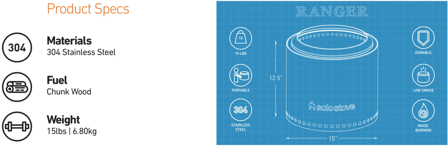 The Solo Stove Ranger harnesses our patented design in a more compact size and travel friendly size. The Ranger sets up and starts quickly allowing you to have a no-trace fire in more places than just the backyard. The double wall design creates a burst of hot air over the fire reducing the smoke without the use of batteries and fans. By design, Ranger burns wood so efficiently you’ll only be left with ultra-fine ash making clean up as simple as dumping out the spent ash.