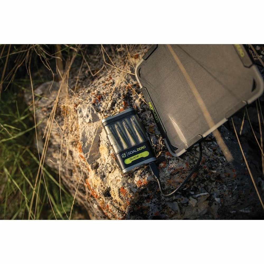 A lightweight solution for on-the-go power from the sun, the Nomad 5 features 5W of monocrystalline solar panel in a rugged enclosure with an easy-to-use kickstand and USB output. It connects to the Guide 12 to charge AA/AAA batteries from the sun, which can also used to power your phone, wearables, GPS, or quickly boost your tablet. Guide 12 features an increased battery size and USB-C input/USB-A output ports.