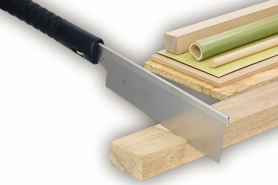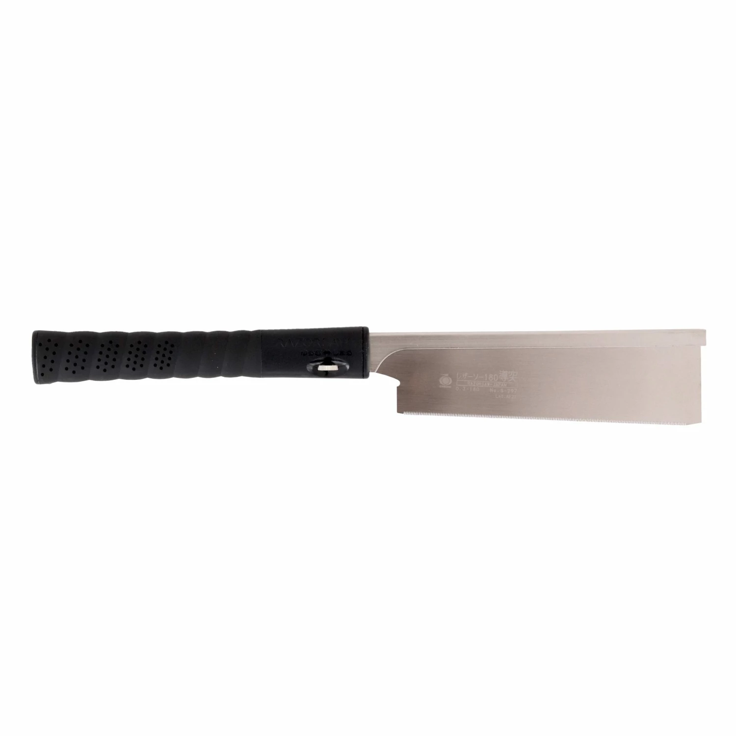 They come with a handle made out of elastomer resin. Our 180mm Dozuki saws are 0.3mm thick. They are great for finishing work. The long metal spline holds the blade.It can cut general timber, Laminated wood, Bamboo material, Ply wood, MDF panel, Particle board (OSB), and Formica laminate.
