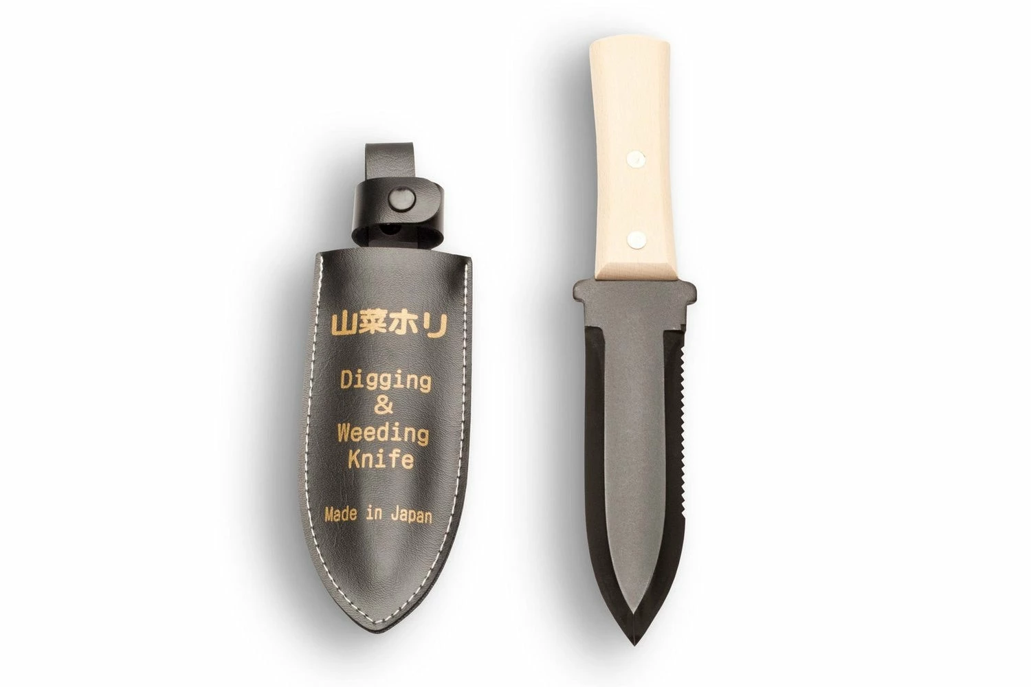 Traditionally used in Japan to collect specimens for bonsai, the knife has a heavy steel blade that is dished, with a serrated edge on one side and a sharpened edge on the other.