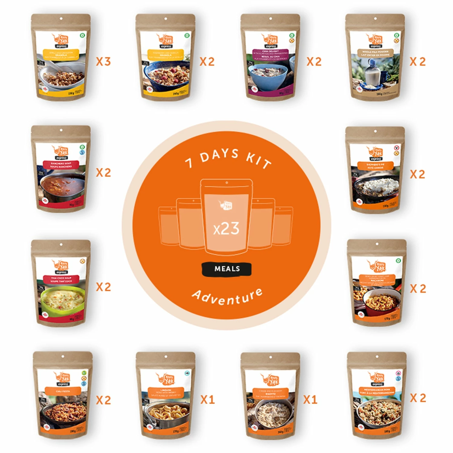 The ultimate kit for a short expedition or as a backup supply! The 7 days kit contains a variety of meals including breakfasts, soups and meals. Bonus: Two bags of whole milk powder for your cereal or your best homemade recipes! High in protein with a total of 619g and 12,300 calories, the 7 Days Kit – Adventure will give you the energy you need. Enough to fuel you no matter what the situation!Â
