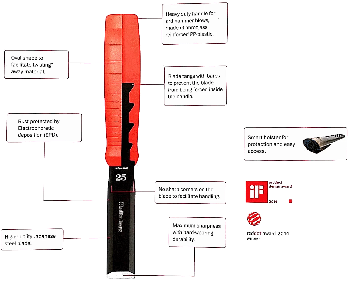 An everyday chisel, sharp, reliable and always at hand. Ready for tough precision and all-round use, from adjusting and fitting to prying and demolishing. Perfectly sharpened high-quality Japanese steel blade with heavy-duty handle designed for hard hammer blows. Smart holster with a clip for easy access at all times.