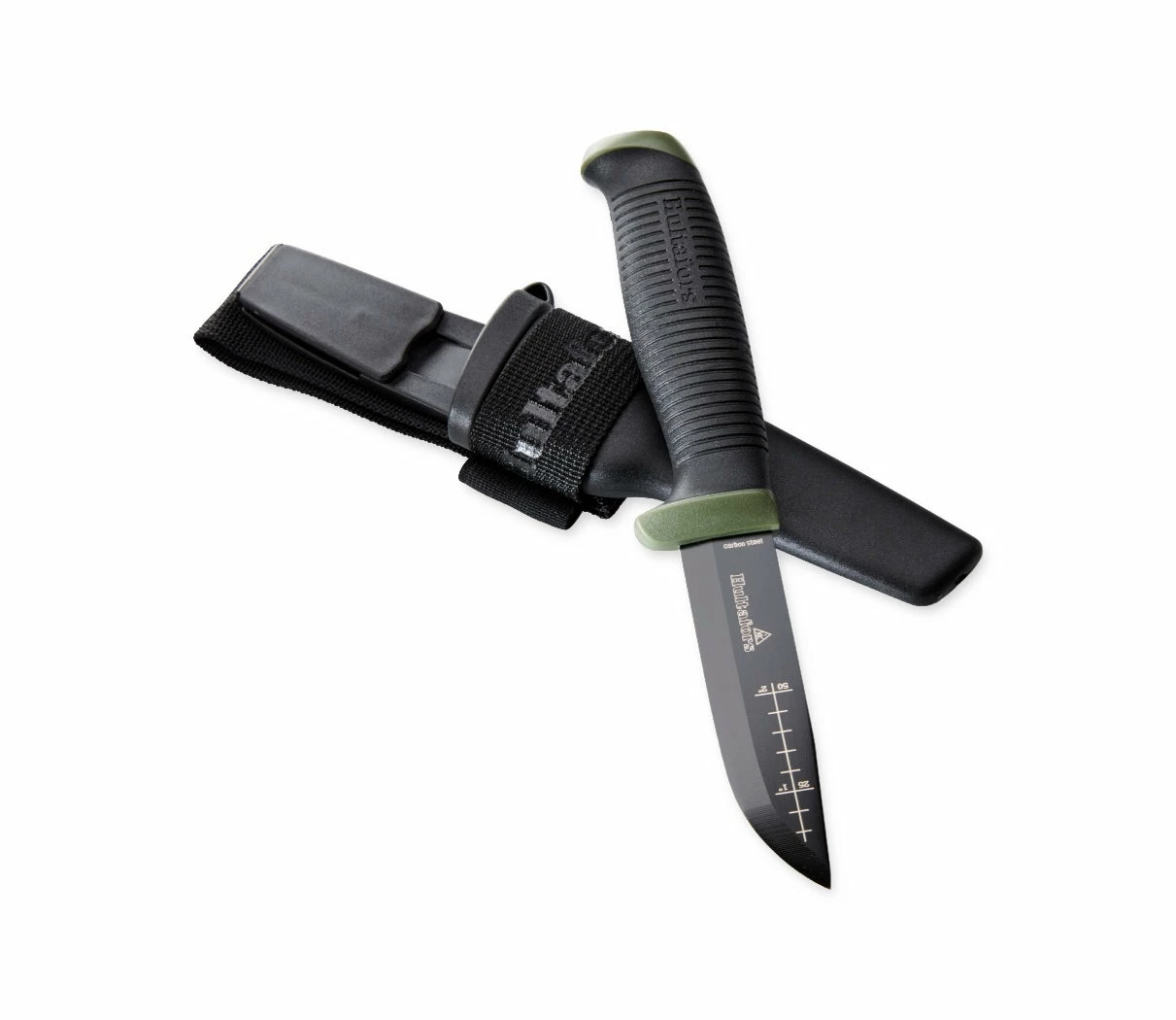 A durable outdoor knife with friction grip suitable for tough tasks in the field. The hardwearing textile beltloop allows up to 80mm wide belts and is equipped with a pocket for a fire starter. The blade has a scandi grind and is made from Japanese knife steel, 3.0 mm carbon steel that has been hardened to 58–60 HRC and has a rust protective electrophoretic deposition coating to withstand corrosion. The grinded spine of the blade is designed for starting a fire with a fire starter.