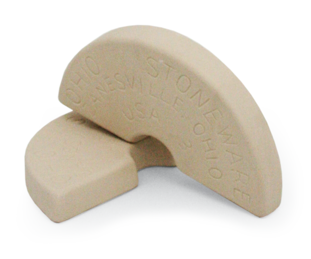 This weight set consists of two semi-circular stones designed to fit Ohio Stoneware’s Preserving Crocks. The weights are unglazed and used for food preservation. The stones rest on top of food inside of the crock to keep food in the brine for proper fermentation.