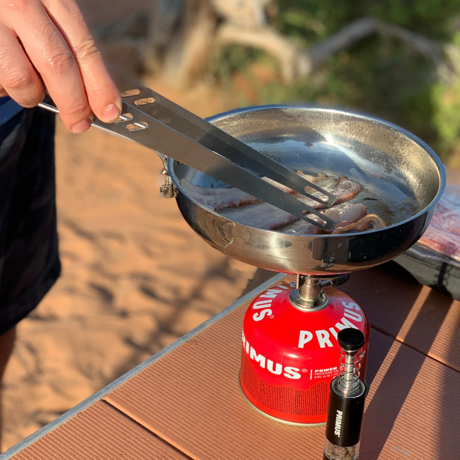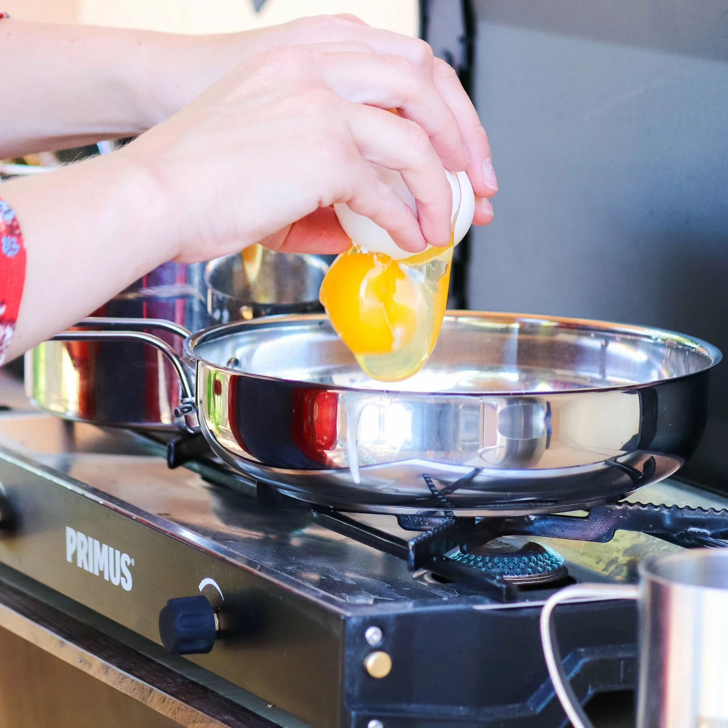 Durable frying pan in 18/8 stainless steel with aluminum clad bottom for an even heat distribution. The pans can be placed directly on open fire and offers a very compact pack size thanks to the foldaway handle in stainless steel. Comes with a storage bag.
