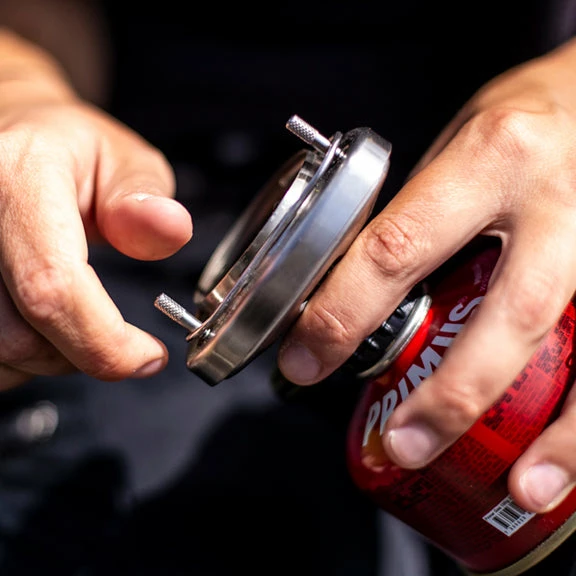 - Lightweight system stove burner locks securely to the pot when in use and packs conveniently inside with a 100g gas canister for ultimate travel experience