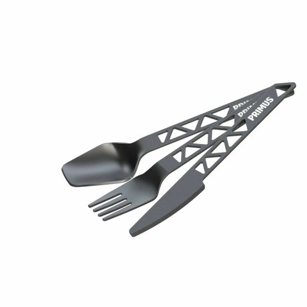 Fork, knife and spoon in high-grade, hard-anodized aluminum. Low weight and excellent durability. This set is dishwasher safe for easy cleaning when you get off the trail.