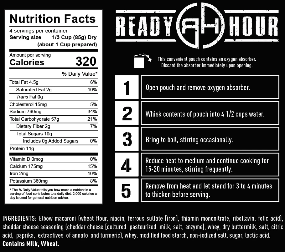 Ready Hour Macaroni and Cheese fits that bill. Our Mac and Cheese comes in our Case Pack which has 24 servings in individual packs – 6 of them. Needed convenience when you are able eat what you need now, and save the rest for years to come as part of your food storage plan.
