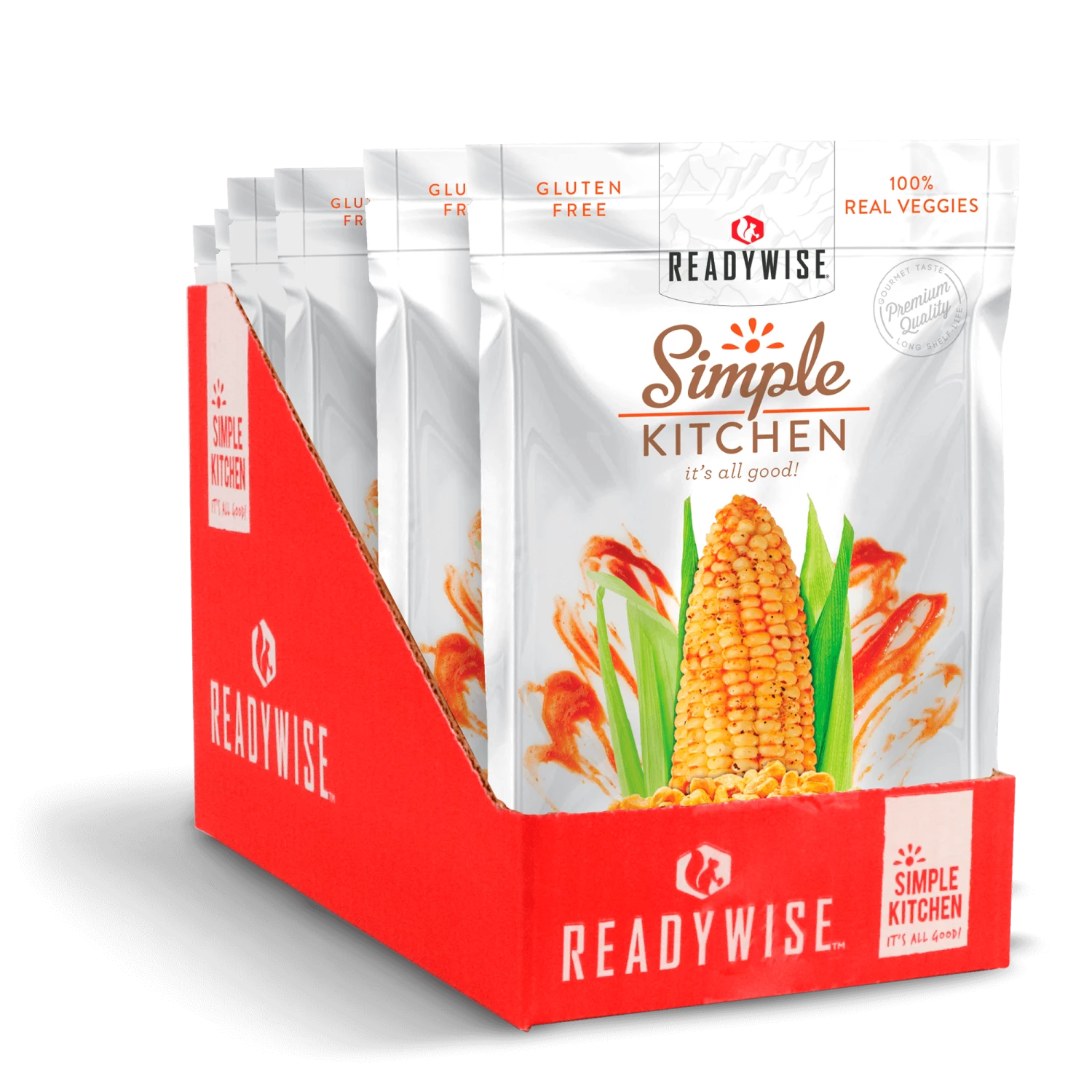 This box includes six pouches of Simple Kitchen’s (a ReadyWise Company brand) Sriracha Corn.