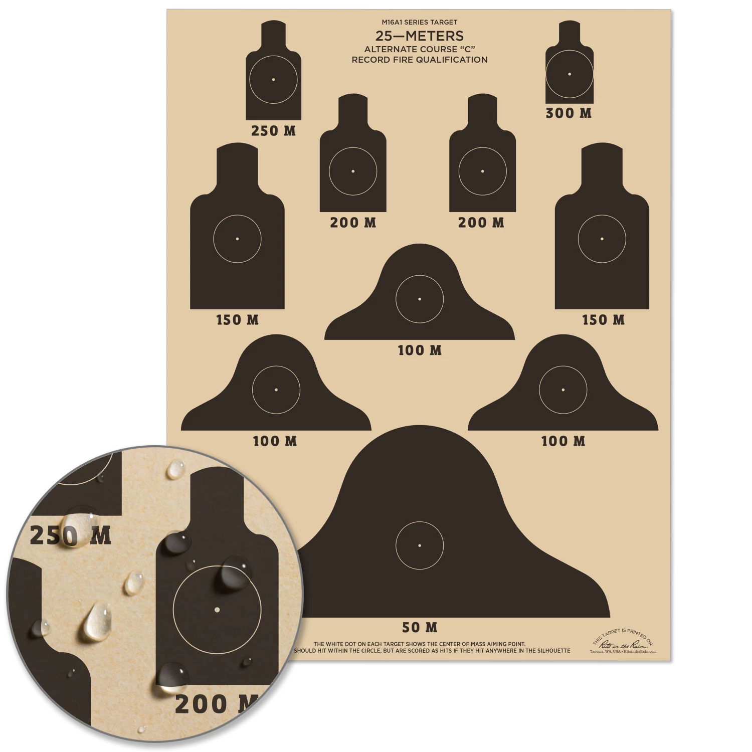 The Rite in the Rain all-weather alt-c target helps shooters and instructors conducting the alternate course “C” course of fire qualification. the alt-c target has scaled target areas that simulates various distances on a fixed-distance shooting range. the procedure for the course calls for fire from three positions: prone supported, prone unsupported, and kneeling. by simulating fire on a variety of distances from a variety of positions, the alt-c qualification is a relatively comprehensive test of basic marksmanship. Rite in the Rain targets use our patented all-weather paper that endures moisture and creates clean exit holes for easy evaluation of shot placement. that paper strength also comes in handy to reduce situations in which large chunks are blown out of the target from closely-grouped rounds, complicating accurate scoring.