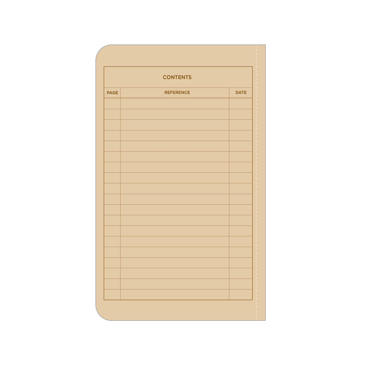 COVER / BINDING: Everything in this bound book is designed to survive Mother Nature’s wrath. The Fabrikoid cover, the Rite in the Rain paper, the sewn-in pages, even the glue is weatherproof.