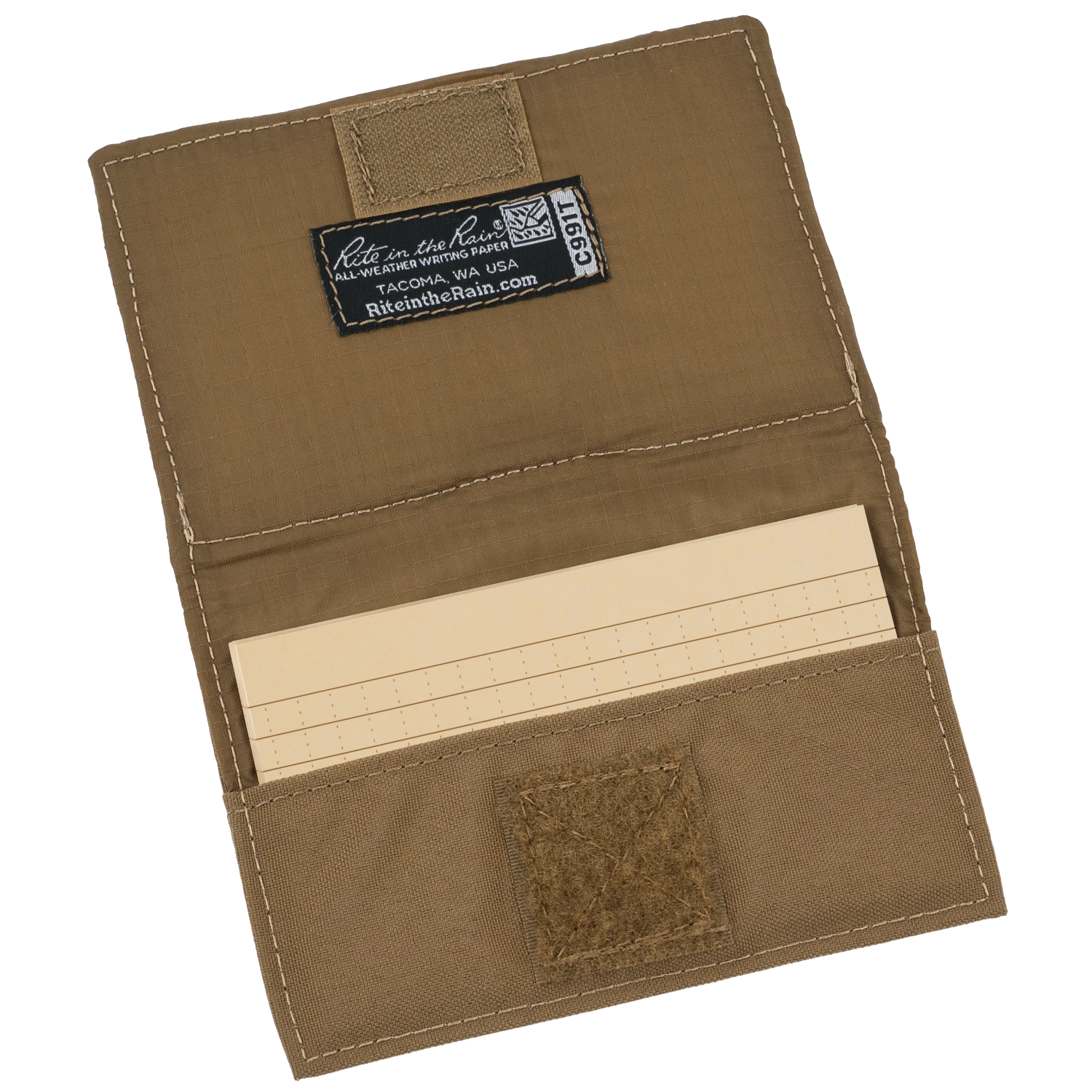 Repels water, sweat, grease, and mud Tough Cardura fabric with Velcro closure Fits 3 index cards and 1 pen (outside), 25 index cards (inside) Internal storage pocket and external storage: corner grip straps and pen loop Use Pencil or weatherproof pen (no gels or water-based inks)