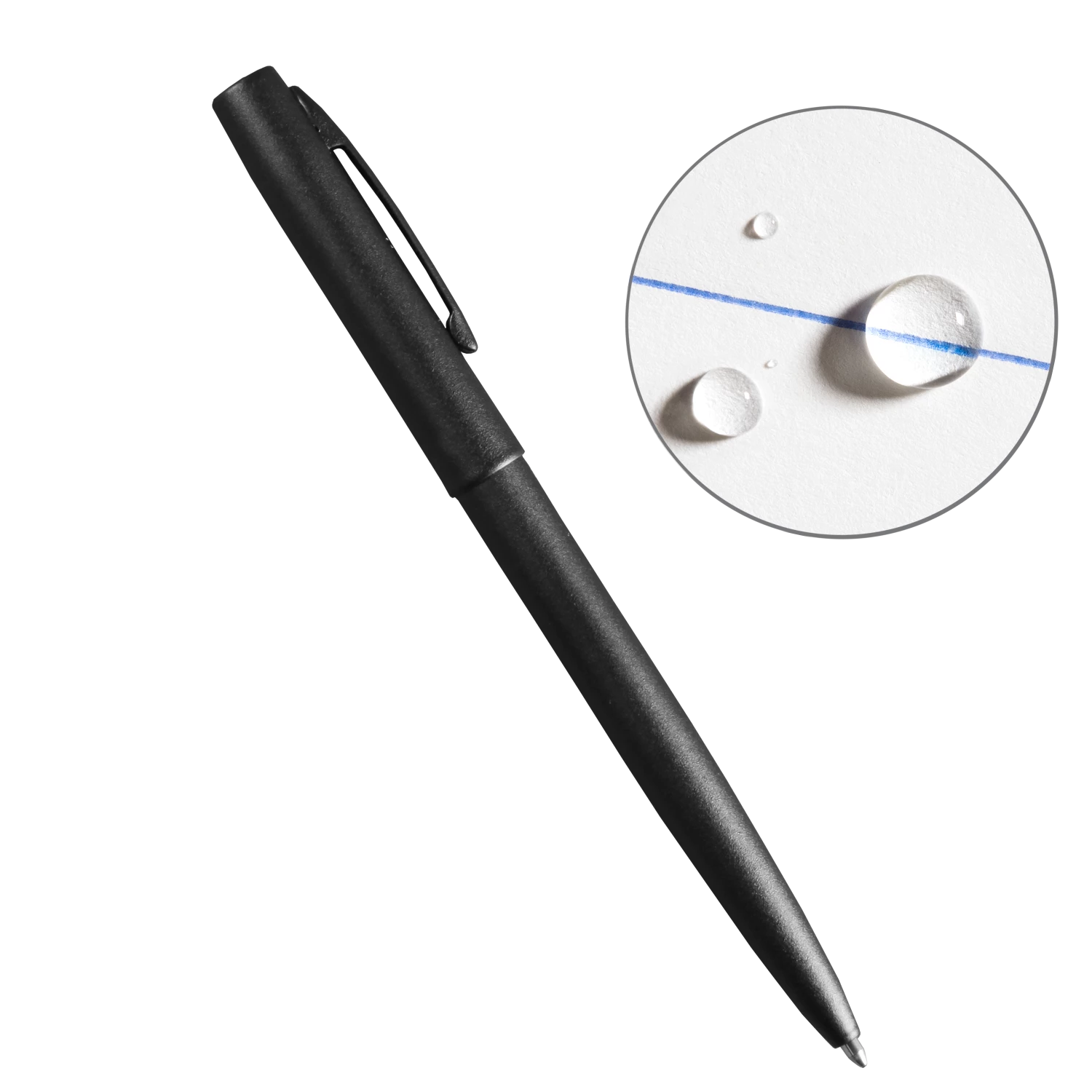 Pencils will work great on Rite in the Rain All-Weather Paper but sometimes you need a pen. This All-Weather Metal Clicker Pen writes on wet paper and upside down, the pressurized ink cartridge performs in temperatures from -30F to 250F. The ink won’t leak, evaporate, or blow up in your pocket. 5.25 in long, with a Barrel Diameter of 0.375 in. Black barrel. Black ink. Refill cartridges available.