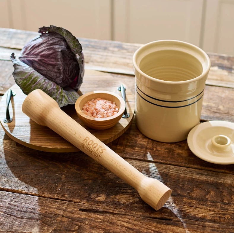 Easily pound and compact cabbage, and other vegetables into crocks and canning jars for fermenting with our extra-long 13″ Wooden Cabbage Stomper.
