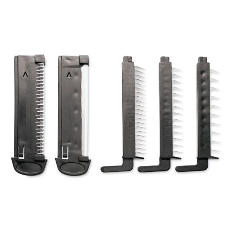 5 Interchangeable Blades Included: 5 ultra-sharp stainless steel blades that will slice your food effortlessly: 3 Julienne Blades, Slicing Blade, and Waffle Blade. Plastic food pusher with handguard included.