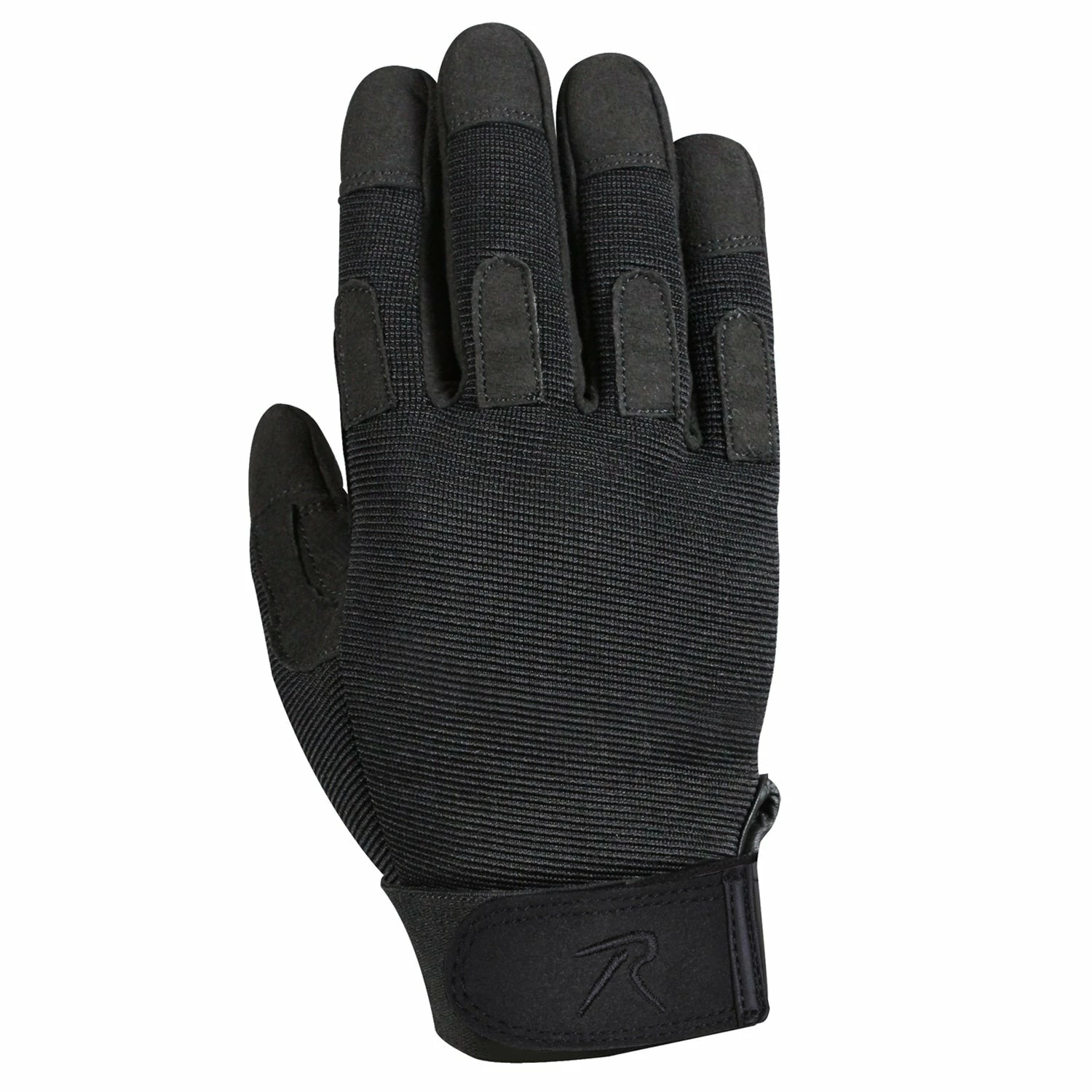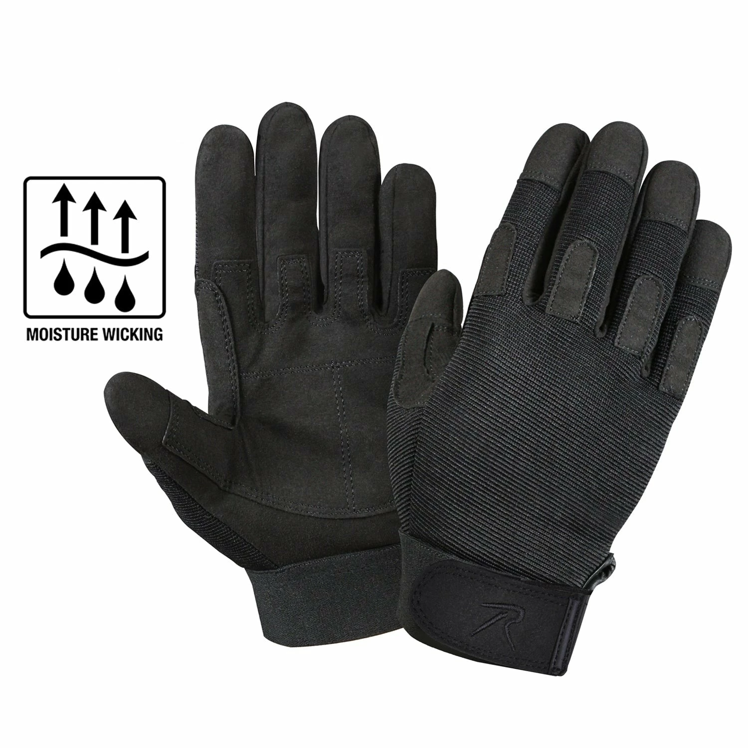 Rothco’s Lightweight All-purpose Duty Gloves feature a moisture-wicking, polyester spandex fabric, synthetic leather palm & fingers for grip and durability, finger and knuckle patches, elastic cuff with hook & loop wrist closure.