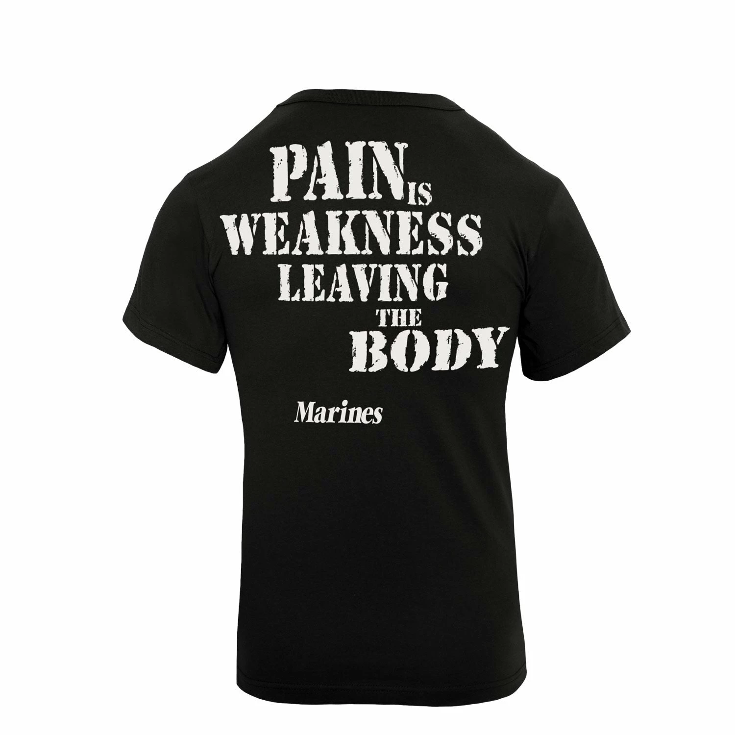 Officially licensed by U.S. Marines, Rothco’s “Pain Is Weakness Leaving The Body” T-shirt features a two-sided print with a Marines logo on the front chest and “Pain is Weakness” slogan on the back.