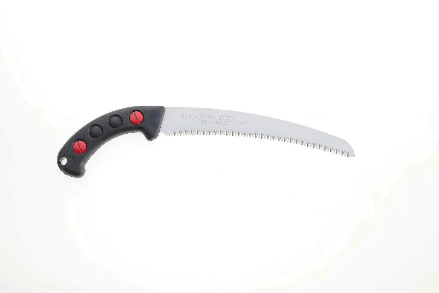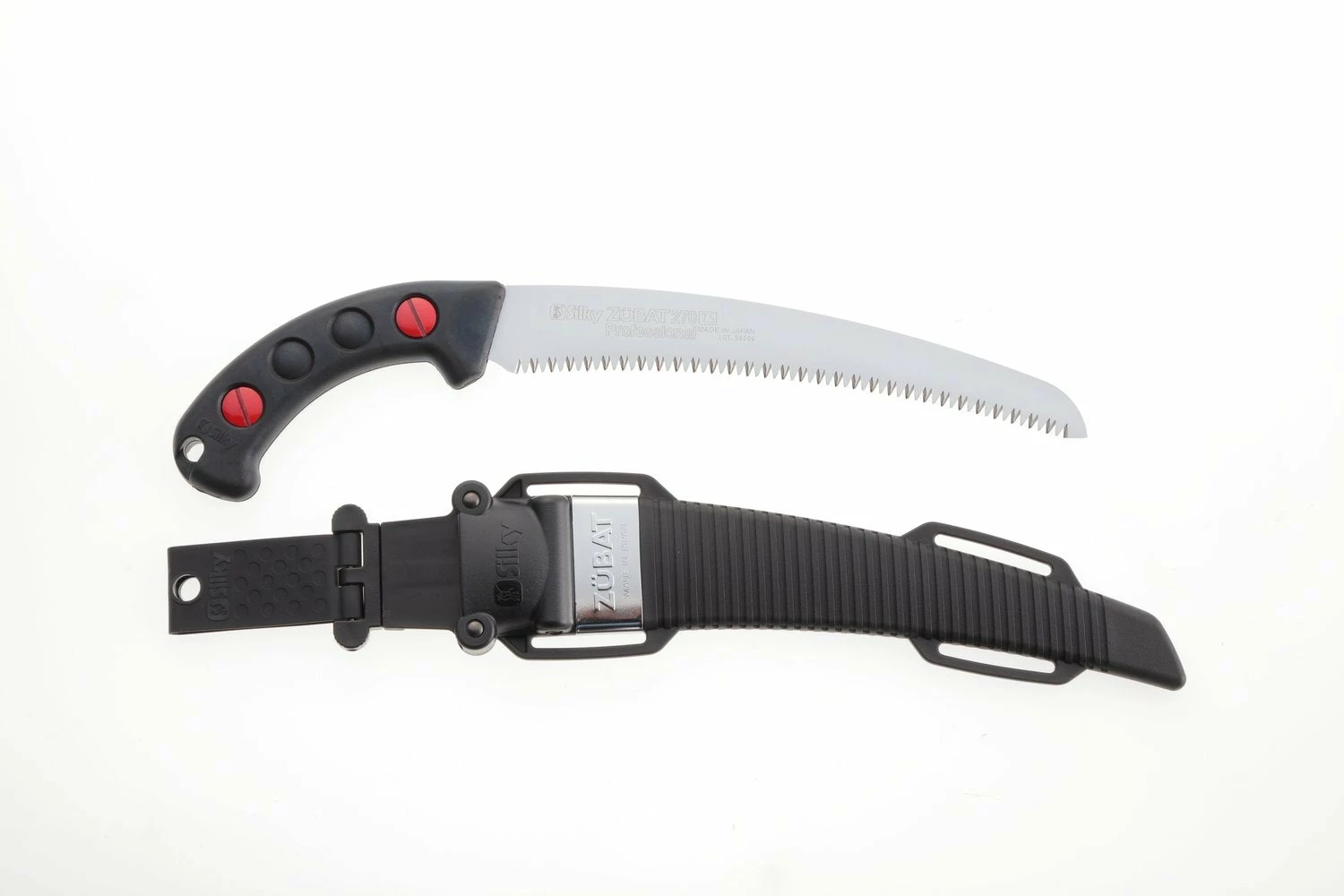 Features rust-resistant, hard chrome-plated, taper-ground curved blade with an impulse-hardened non-set tooth design. Curved blade provides greater cutting speed with less effort. Utilizes proprietary Silky MIRAI-ME (Smooth Cutting) Technology – The Teeth of the Future! The precision-ground, razor-sharp teeth with four cutting angles provide fast, clean and extremely smooth cutting action. The hard chrome-plated blade has 6.5 teeth per inch, resists rust and effects of tree resin, and wipes clean easily. Molded-rubber handle holds the high-performance fast-cutting curved blade that fits securely inside its custom-fitted, pivoting, black polypropylene sheath with detachable belt holder. Great combination of high performance curved blade with a comfortable sure-grip handle that really sticks in your hands. Exceptional design, strength, balance and superior finish quality. Suitable for all pruning tasks and cutting large branches. Made in Japan. ZUBAT is available in five blade lengths: 9-1/2-inch (240 mm), 10-2/3-inch (270 mm), 11-4/5-inch (300 mm), 13-inch (330 mm) and 15-2/5-inch (390 mm).