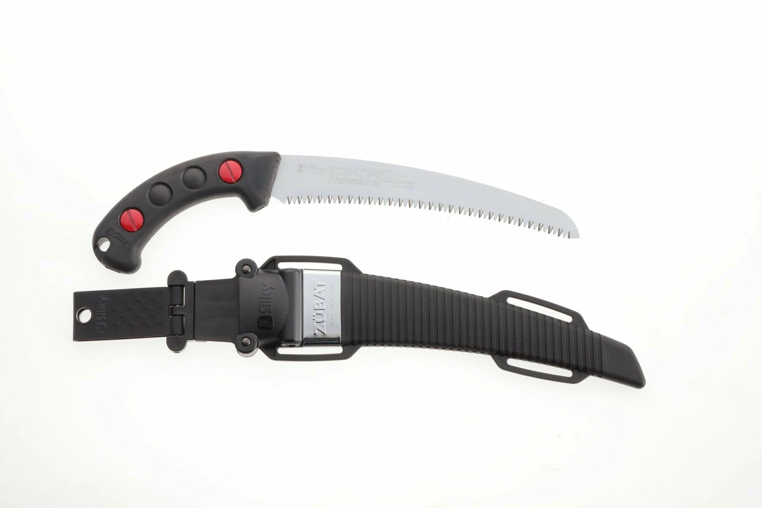 Features rust-resistant, hard chrome-plated, taper-ground curved blade with an impulse-hardened non-set tooth design. Curved blade provides greater cutting speed with less effort. Utilizes proprietary Silky MIRAI-ME (Smooth Cutting) Technology – The Teeth of the Future! The precision-ground, razor-sharp teeth with four cutting angles provide fast, clean and extremely smooth cutting action. The hard chrome-plated blade has 6.5 teeth per inch, resists rust and effects of tree resin, and wipes clean easily. Molded-rubber handle holds the high-performance, fast-cutting, curved blade that fits securely inside its custom-fitted, pivoting, black polypropylene sheath with detachable belt holder. Great combination of high performance curved blade with a comfortable sure-grip handle that really sticks in your hands. Exceptional design, strength, balance and superior finish quality. Suitable for all pruning tasks and cutting large branches. Made in Japan. ZUBAT is available in five blade lengths: 9-1/2-inch (240 mm), 10-2/3-inch (270 mm), 11-4/5-inch (300 mm), 13-inch (330 mm) and 15-2/5-inch (390 mm).