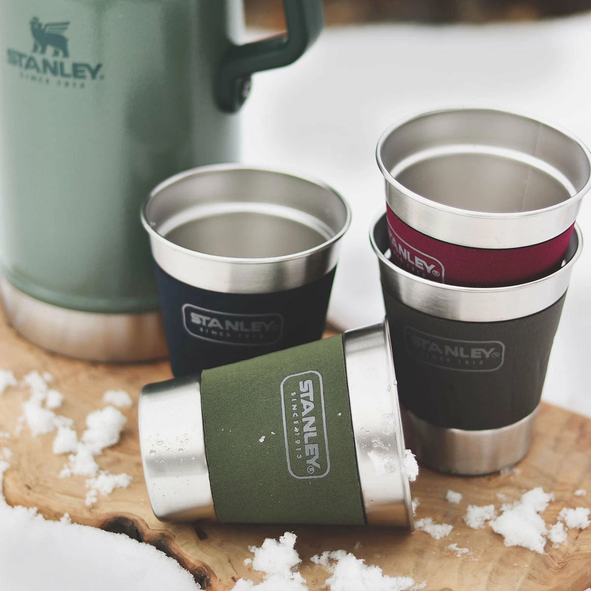 - [4] Stacking steel tumblers in navy, green, grey, and burgundy (12 OZ /.35 L)