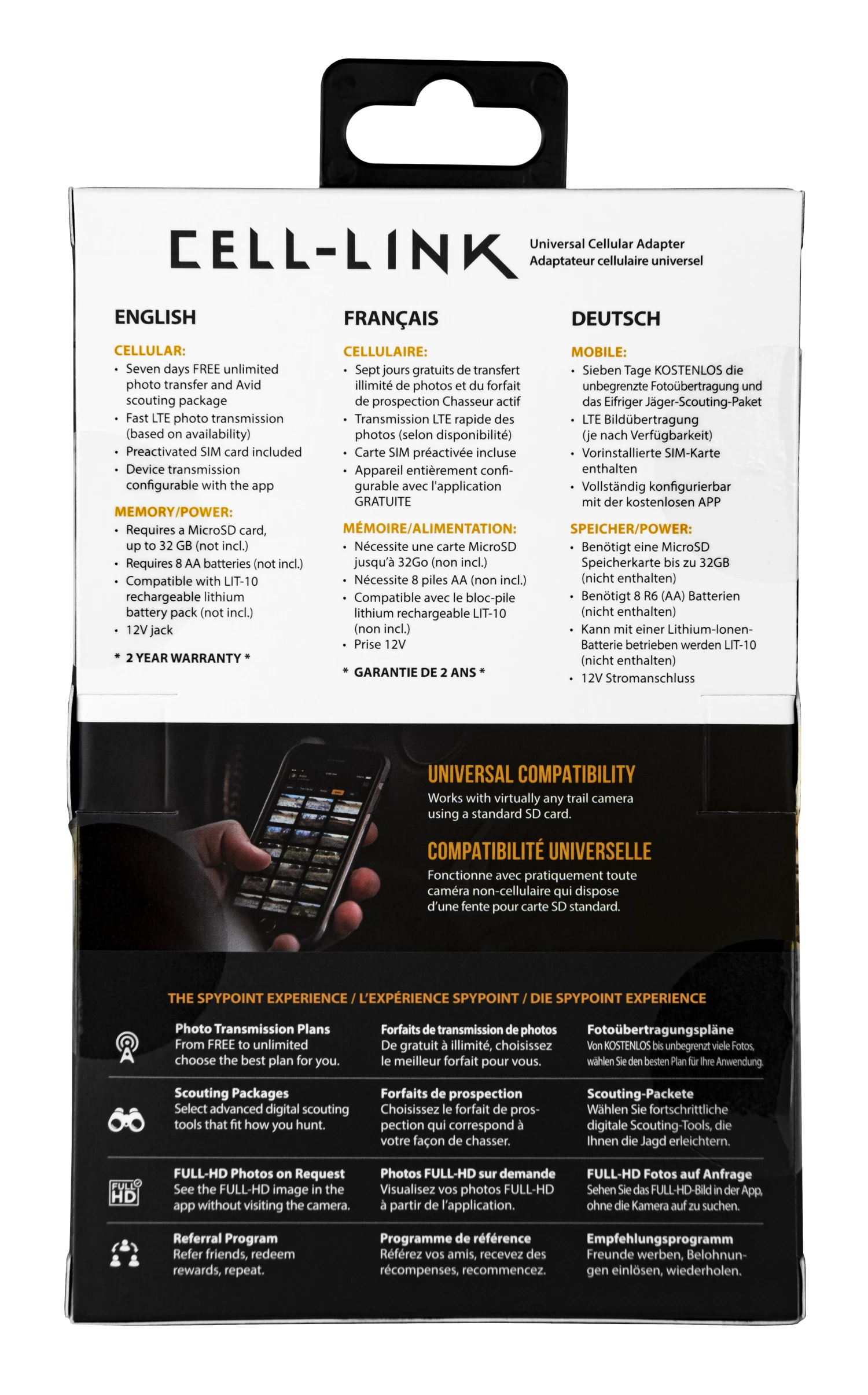 The CELL-LINK takes your scouting to the next level, the cellular level, by turning your current non-cellular camera into a cellular capable device. You no longer have to make trips to pull cards, risking leaving your scent behind, or wait weeks to see what bucks are showing up on camera. Take advantage of the SPYPOINT EXPERIENCE and the advanced digital scouting features that come with it.