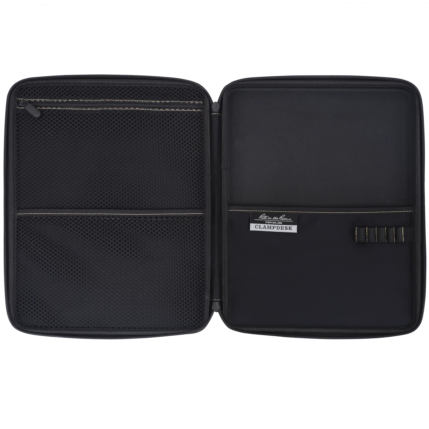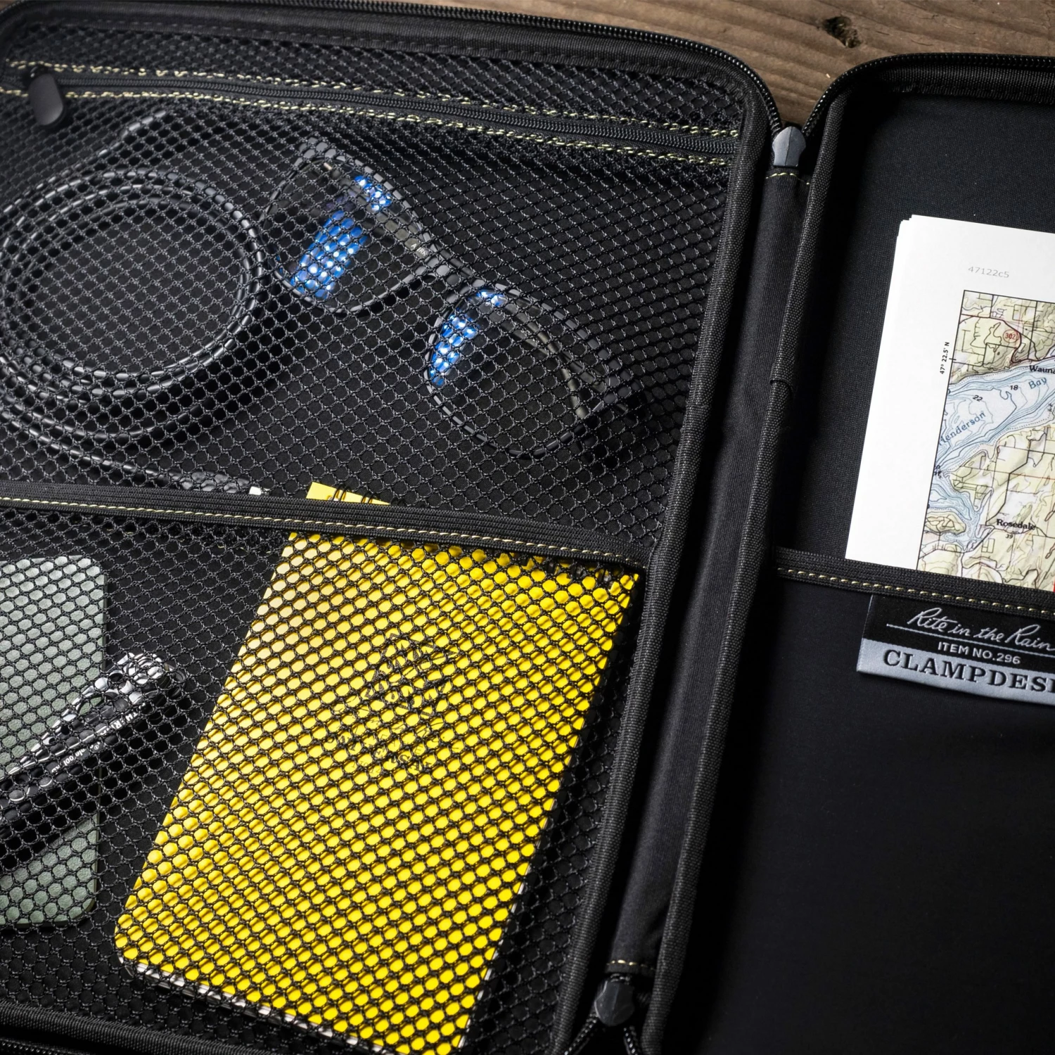 The Rite in the Rain Clampdesk secures your hard-earned notes and stores all of your field writing essentials. A strong clip and a second elastic band team up to lock down your document to the writing surface. Exterior pen loops keep a writing instrument at the ready. Inside the Clampdesk, handy mesh pockets permit storage of small field gear. More pen loops keep a stable of writing utensils at the ready, and an elastic document pocket neatly stores a stack of your documents. If you’re far away from your desk, our durable Clampdesk is right at home.