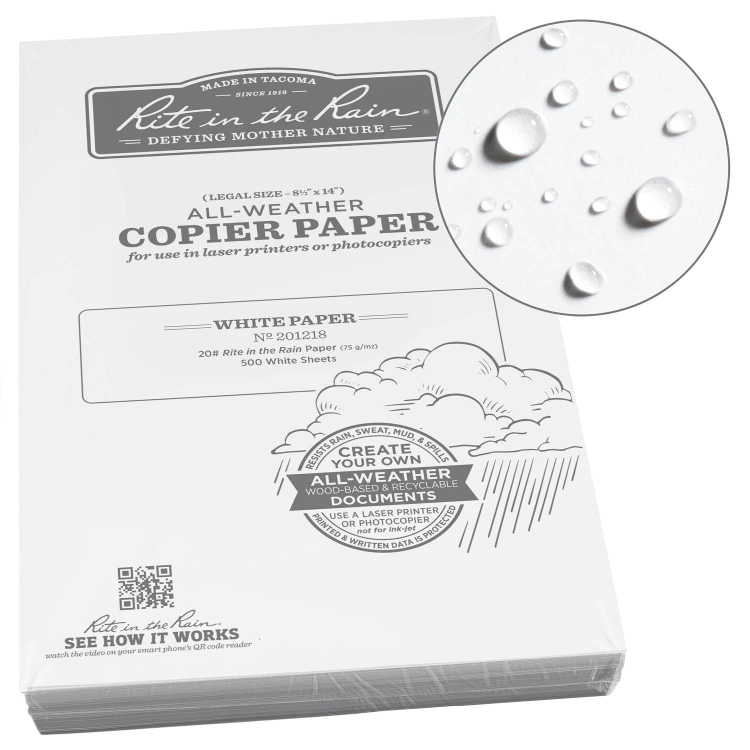 Copy or laser print your own all-weather forms, charts, maps, and worksheets on patented Rite in the Rain All-Weather Copier Paper. Have the convenience of using your existing data sheets on a paper that can survive in any weather condition. For pennies a sheet, Rite in the Rain enables you to work efficiently, regardless of the environment. Paper is 20# bond weight. Completely recyclable wood-based paper. Copy or laser print both sides. Not for inkjet printers.